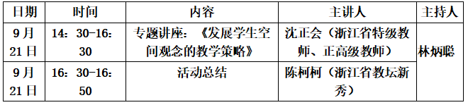 为提升教师专业素养,追寻“有学生、有数学、有技术”的数学课堂。现决定举行温州市陈柯柯“名师送教”工作室发展空间观念专题研讨活动。安排如下:
