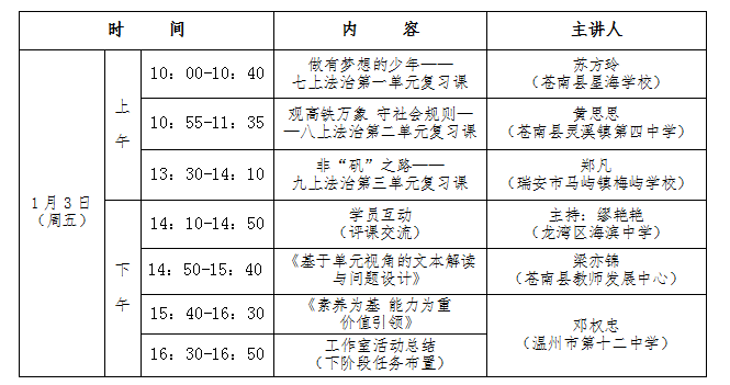 各有关学校,为贯彻和落实新课标教学理念、提高大单元视域下教学和复习的有效性,温州市邓权忠“名师送教”工作室决定开展第十二次研修活动暨送教下乡活动,通过开展以大概念为核心的大单元复习研讨活动,促进农村学校初中社会法治学科教学质量的提升。